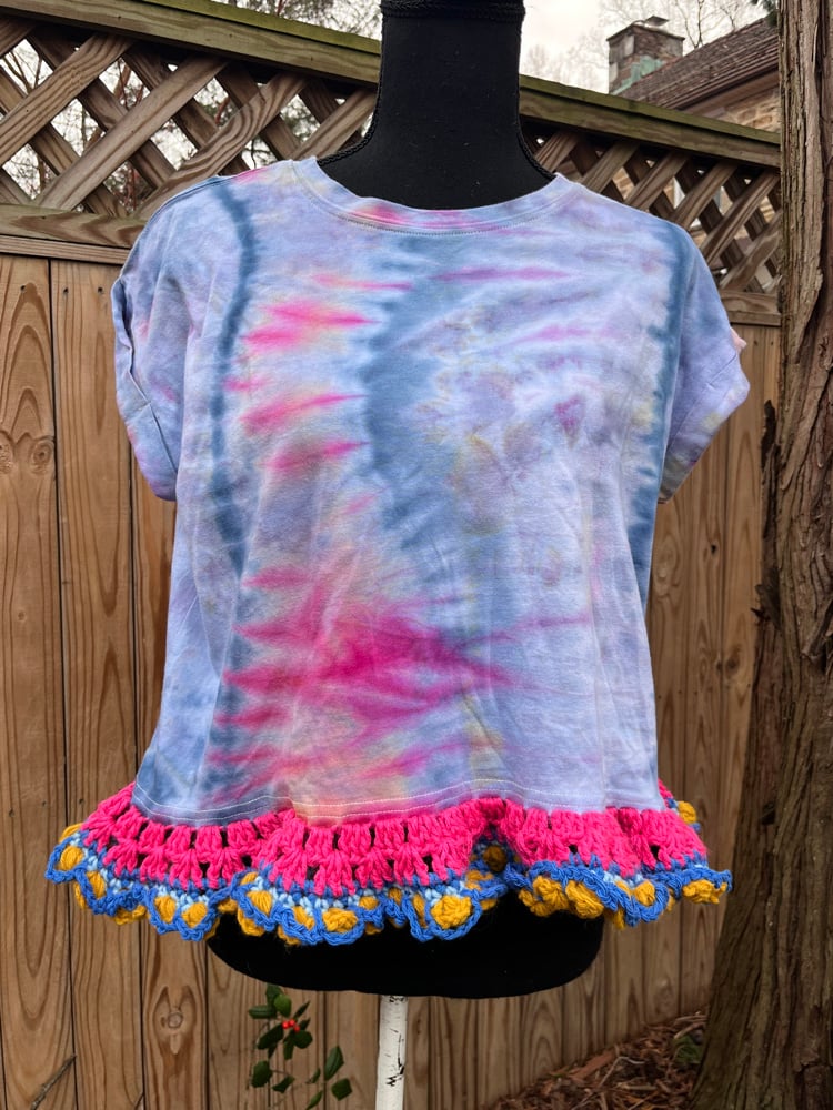 Really one of a kind! Hand crochet detail from my BFF Adriana!! Cute crop top with a fun crochet detail border! Fit is flexible you can size down from your regular size for a shorter fit.