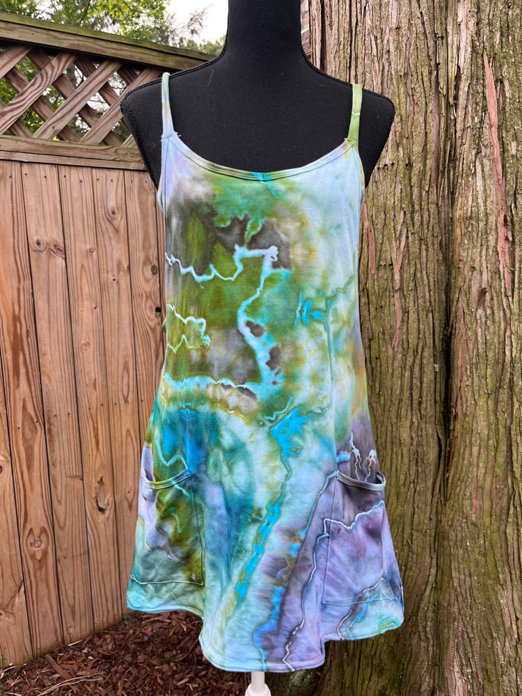 These fun cotton/spandex mini dresses feature a fun unitard romper underneath! Patch pockets on the front and adjustable straps. Fit is flexible and will fit a small and a medium.